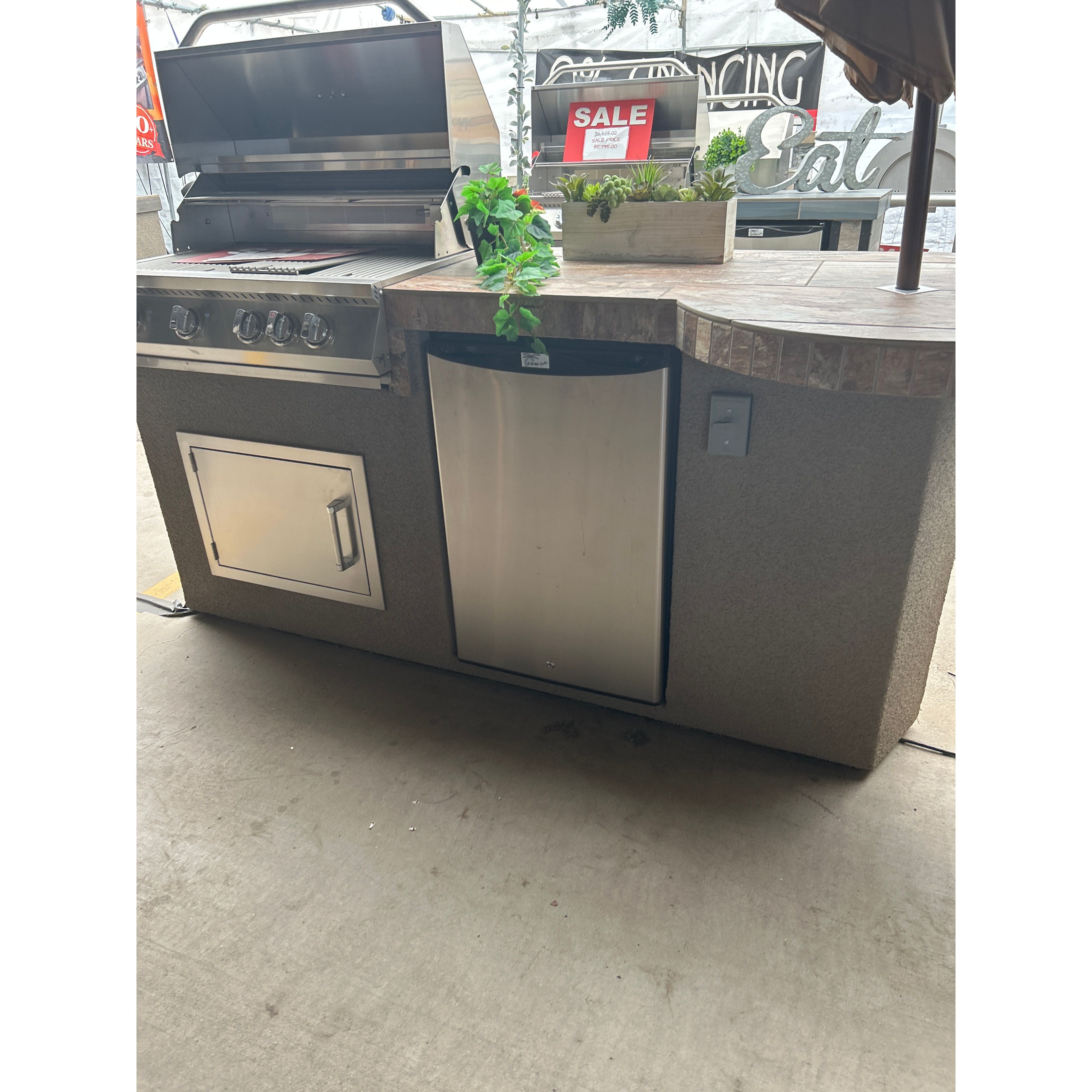 • All-in-one outdoor cooking station: Includes a 4BG KoKoMo Classic Grill, KoKoMo Outdoor Fridge, access door, outlets for power, night-time lighting, and a 9' umbrella for shading.