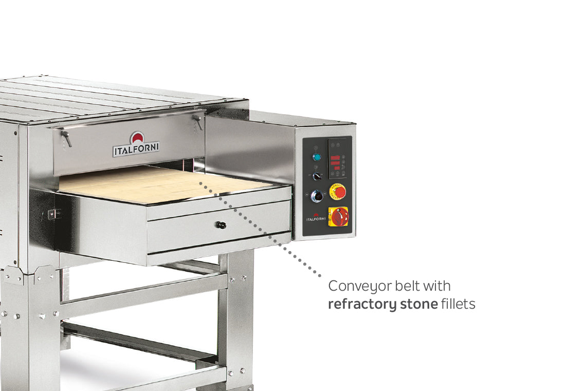 - Static gas conveyor baking on refractory stone: Cooks directly on refractory stone fillets/bars for authentic bottom heat and consistent bake quality across pizzas, focaccia, tortillas, piadine, bruschetta, crostini, chicken wings, and meats.